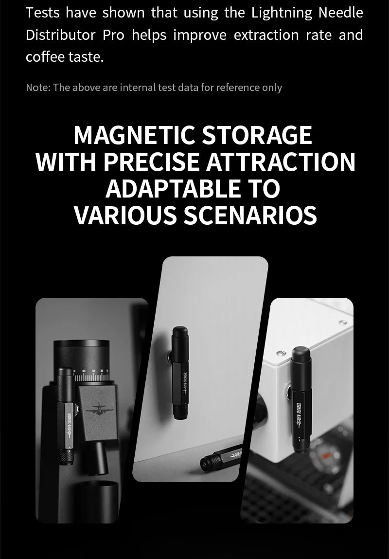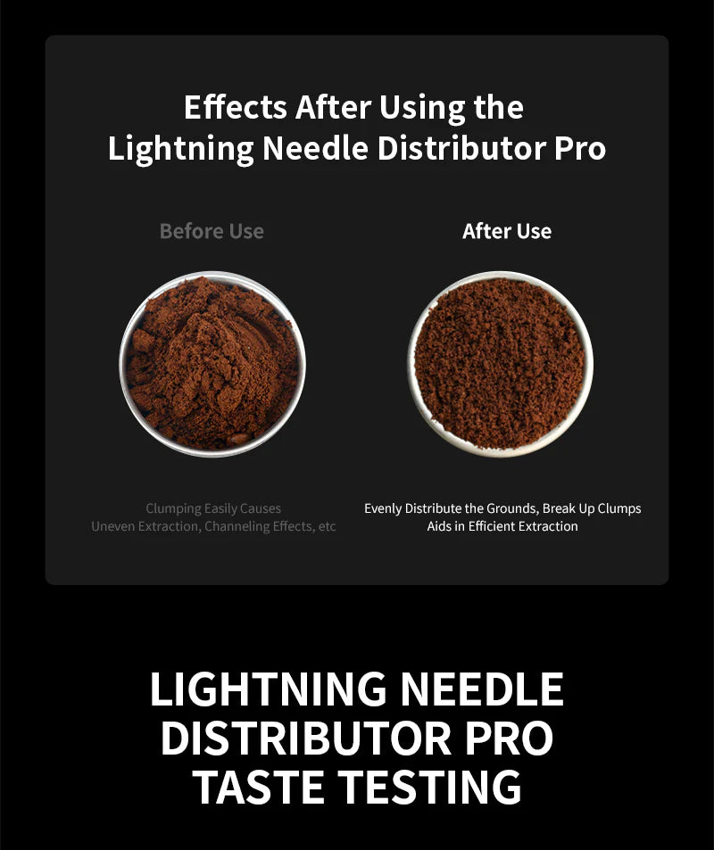 The Lightning Needle Distributor Pro ensures even, consistent grounds distribution for a more efficient extraction and better coffee taste. With its telescopic design, magnetic storage, and adjustable positioning, this tool is designed for both professional and home use. Perfected through testing, it offers optimal performance with every brew—simplifying your process and elevating your coffee.