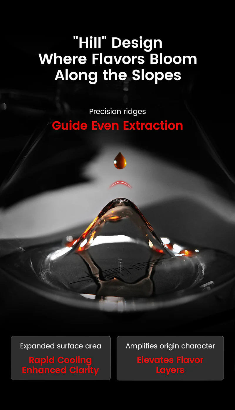 The distinct hill-shaped inner wall increases liquid-air contact, enabling balanced extraction of acidity, sweetness, and aromatics. Rapid cooling prevents over-extraction, ensuring every brew highlights the coffee’s natural character and origin notes.